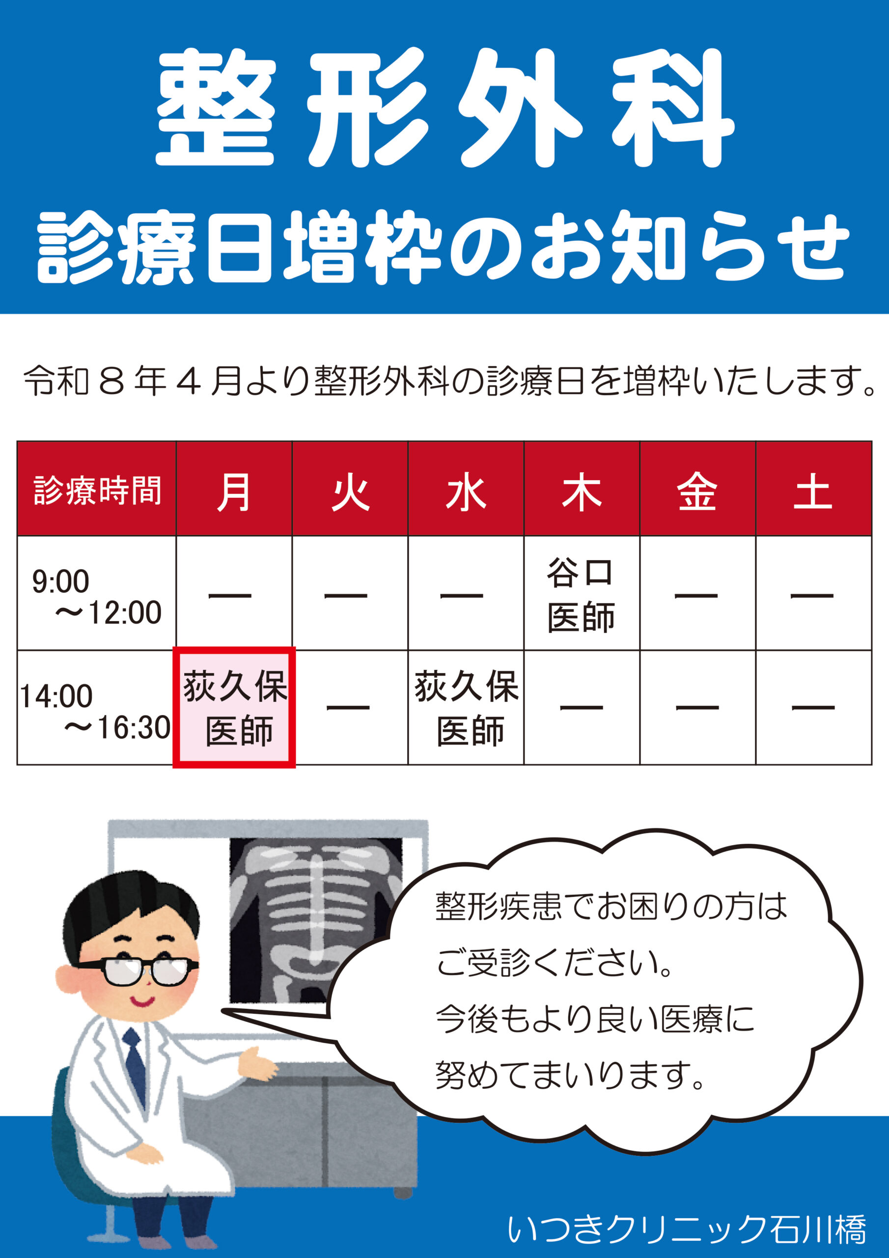 いつきクリニック石川橋:整形外科 診療日増枠のお知らせ