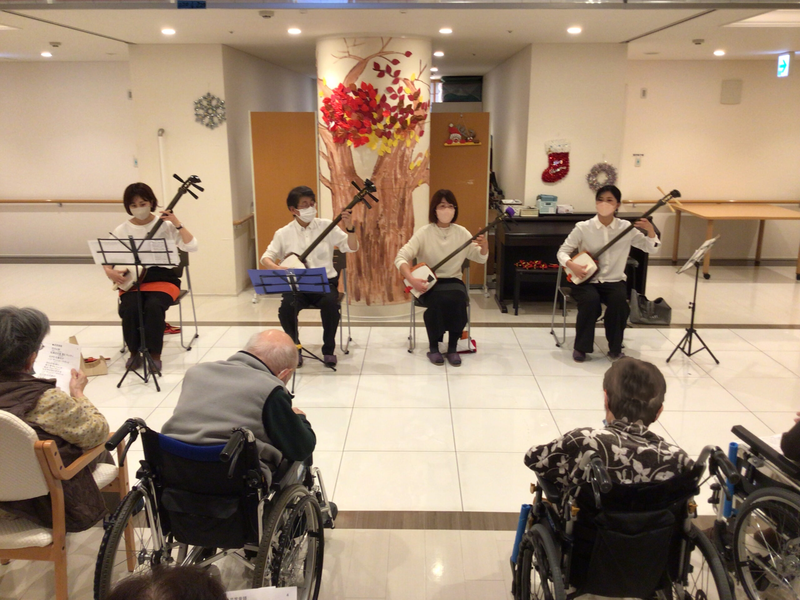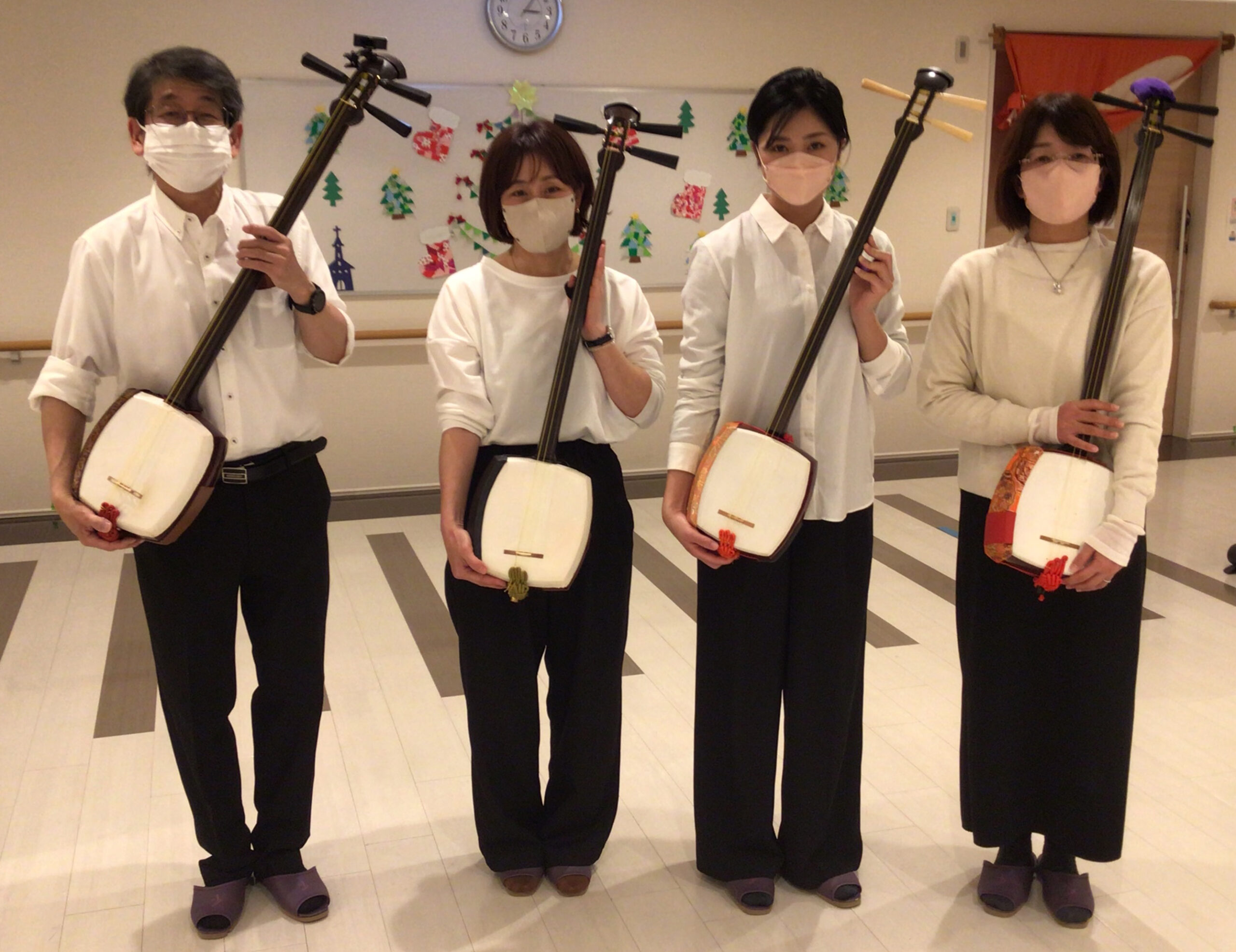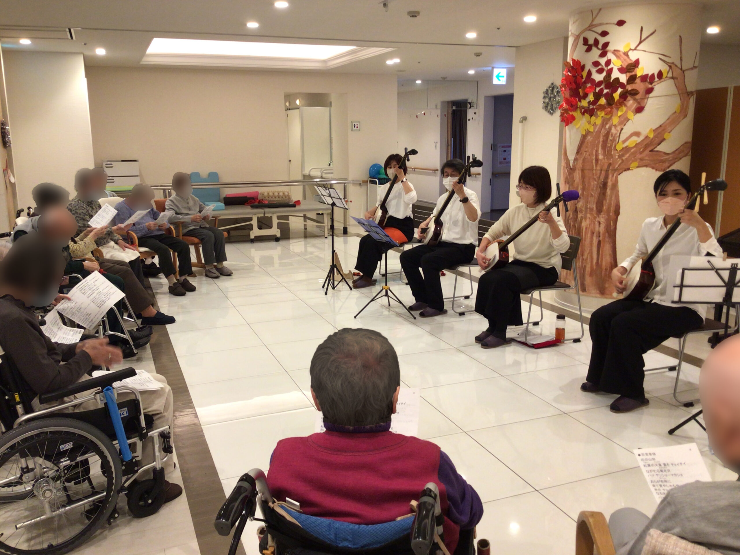 2025年12月4日 いつきの里石川橋:三味線・唄教室「あかい紅葉」の皆さまが来訪 12/4(木)三味線・唄教室「あかい紅葉」の皆さまにご来訪いただき、三味線の生演奏を披露していただきました。津軽三味線や民謡に加え、歌謡曲まで幅広いレパートリーで会場を 盛り上げてくださり、初めて生演奏を聴かれた、ご利用者様から「迫力がすごい」「こころに響いた」と感動の声が聴かれました。力強い響きから繊細な音色まで三味線の魅力を存分に味わえる素晴らしいひとときとなりました。「あかい紅葉」の皆さま、この度はありがとうございました。